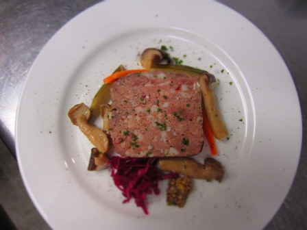 これを分厚くカットし、まわりに自家製ピクルス・キノコのヴィネグレットのマリネ・紫キャベツの酢漬け・粒マスタードを添えました。